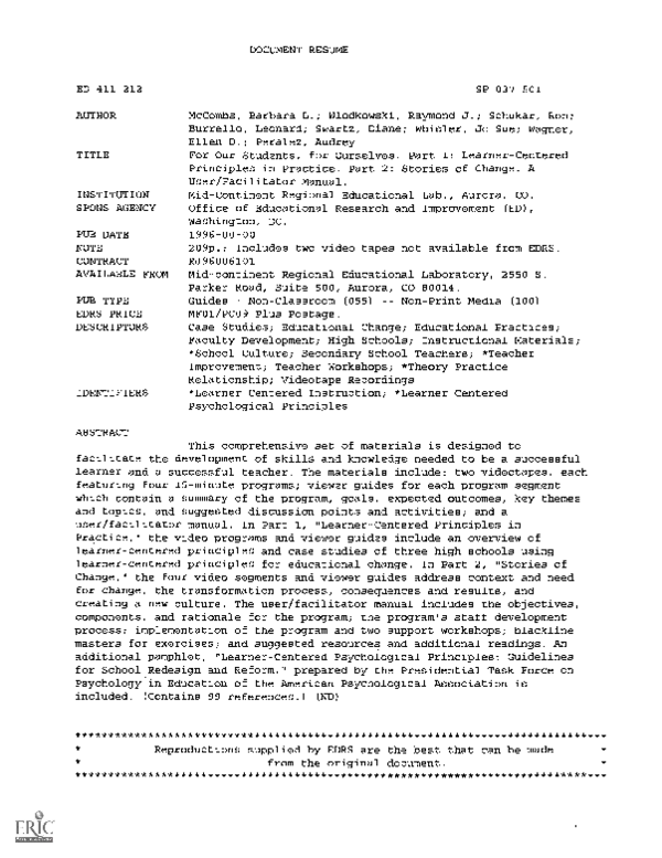Pdf For Our Students For Ourselves Part 1 Learner Centered Principles In Practice Part 2 Stories Of Change A User Facilitator Manual Barbara L Mccombs Academia Edu